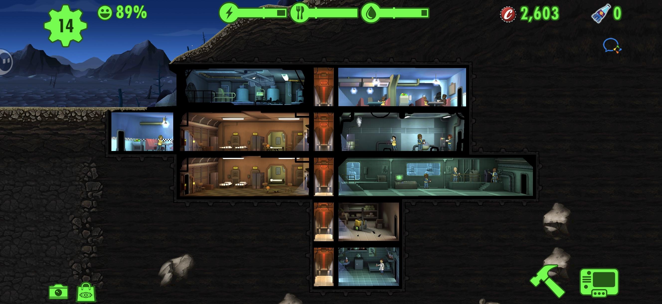 所有房间运行都需要电力,电力不足将无法训练、打造、生产等,所以要保证足够的电力,主要有两点:1.生产力,就是人,我现在有10个小人生产电力勉强够用,后期需要还会增加,因为现在有6个都去生产传奇武器加特林,所以估计需要25-30个S小人2.房间。一是房间数量,没有需要的房间暂时不要建造,平白增加电力负担;二是仓库这种不需要电力的房间放到最下边,即便电力不够,也不会影响仓储数量;三是升级(这点很重