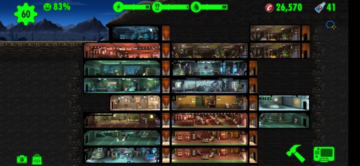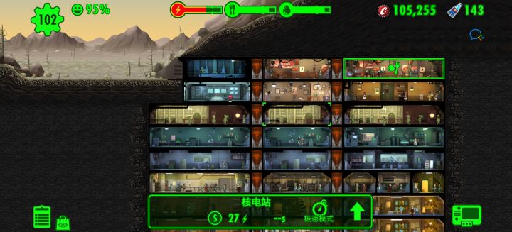 所有房间运行都需要电力,电力不足将无法训练、打造、生产等,所以要保证足够的电力,主要有两点:1.生产力,就是人,我现在有10个小人生产电力勉强够用,后期需要还会增加,因为现在有6个都去生产传奇武器加特林,所以估计需要25-30个S小人2.房间。一是房间数量,没有需要的房间暂时不要建造,平白增加电力负担;二是仓库这种不需要电力的房间放到最下边,即便电力不够,也不会影响仓储数量;三是升级(这点很重
