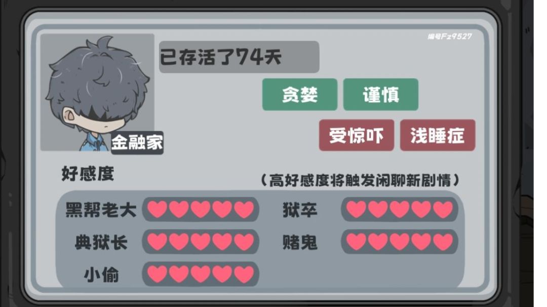 全都拉满了,洗白白等捞 最欧的一次八个煤,嘎嘎舒服 —————————————————————— 人物背景以及对话线索分析 赌鬼 纯赌狗不谈,SSR卡疑似于时间强关联,可能是可以可以兑换时间 小偷 人物背景有点肖申克内味了,不过是给狱警打工的,从狱警的对话中也能得到一些线索。 狱警 指桑骂槐 利用敛财且包庇小偷,不过好像惹不起黑榜大哥 黑榜大哥 重情重义好大哥,为了妻儿拼命挖煤。外面的世界才是真正