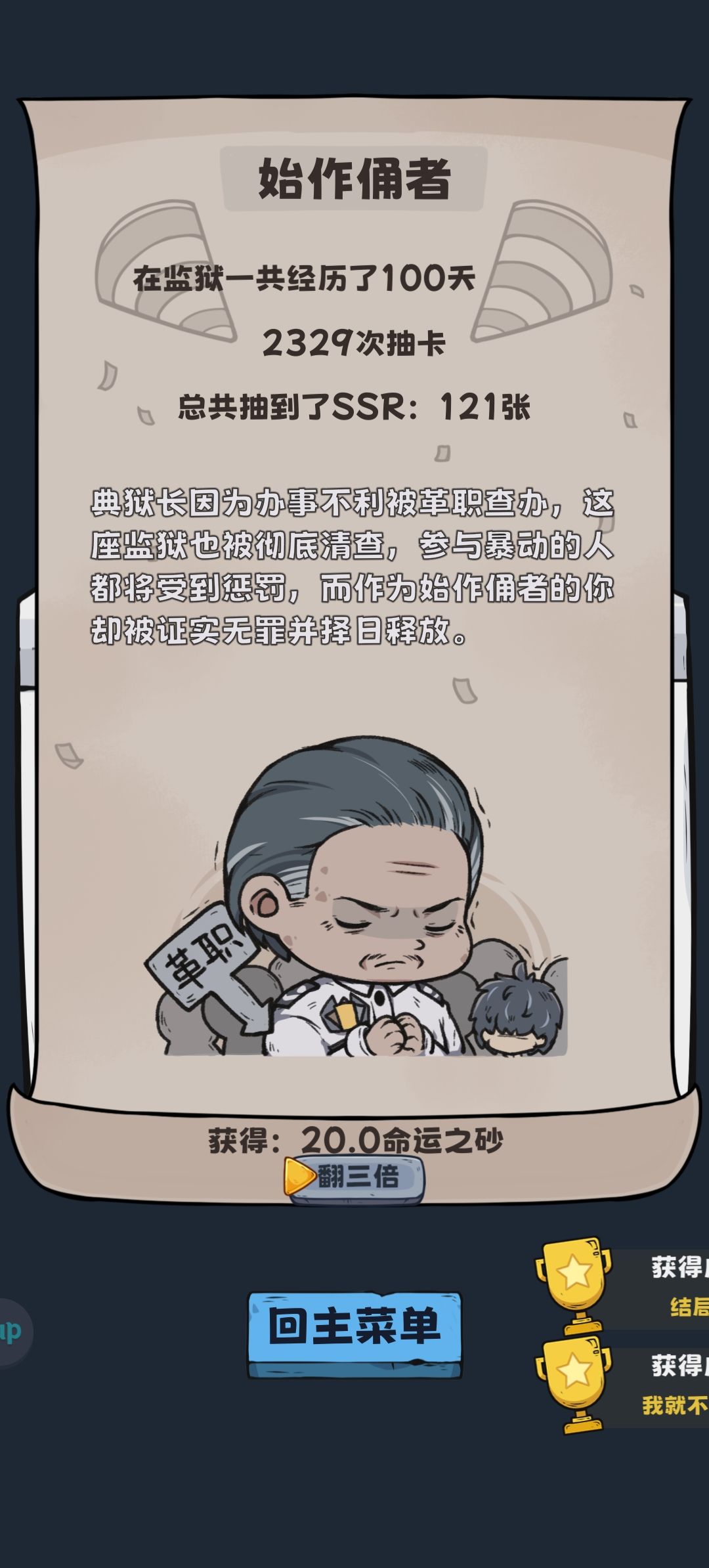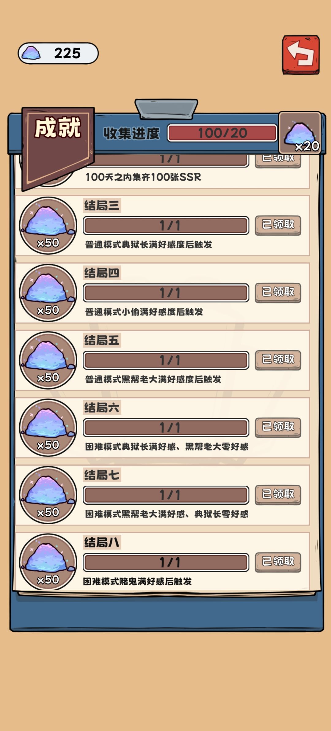 结局一:100天凑不齐100张ssr(有手就行) 结局二:100天内凑够100张ssr达成出狱 结局三:刷满典狱长好感度(每次借满1000)并答应典狱长活够一百天(不用凑齐100ssr) 结局四:刷满狱卒加小偷的好感度并答应小偷攒够2000信用点然后活够100天(不用凑齐ssr) 结局五:刷满黑帮老大好感度并答应黑帮老大攒够100煤矿然后活够100天(不用凑齐ssr) 欢迎补充