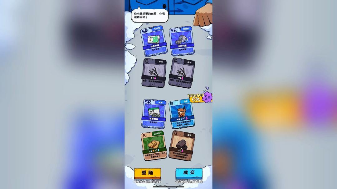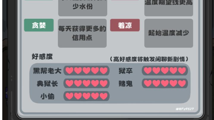前期通关攻略 (典狱长路线) 教大家如何第一次就通关 正面必选谨慎天赋,负面天赋看情况,不要选让精神期望线变高,不要选温度消耗多 (自裁之后重新开始能刷新天赋) 首先选小偷 进入游戏 注意右下角奖励还是挺好的 偷到4天之后抽卡 看看有没有能换的,这有一个较低概率亏本 就是先看看自己有没有的换 能换的话先打开一组四个,看看有没有2张SR没的话就去选对面那组(看见小偷就要交易,很小概率会亏本) 接下来