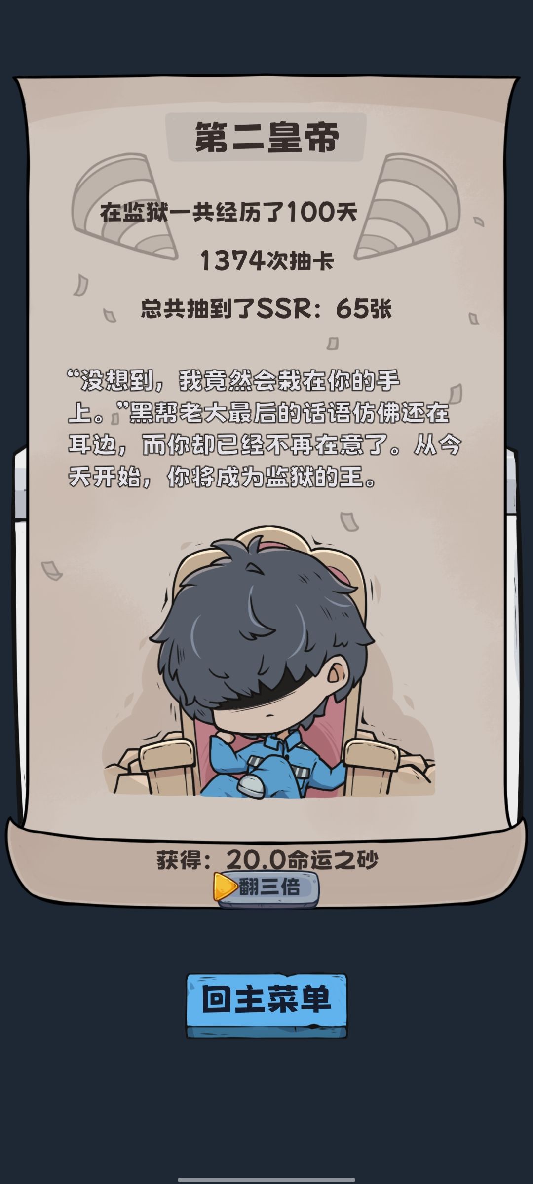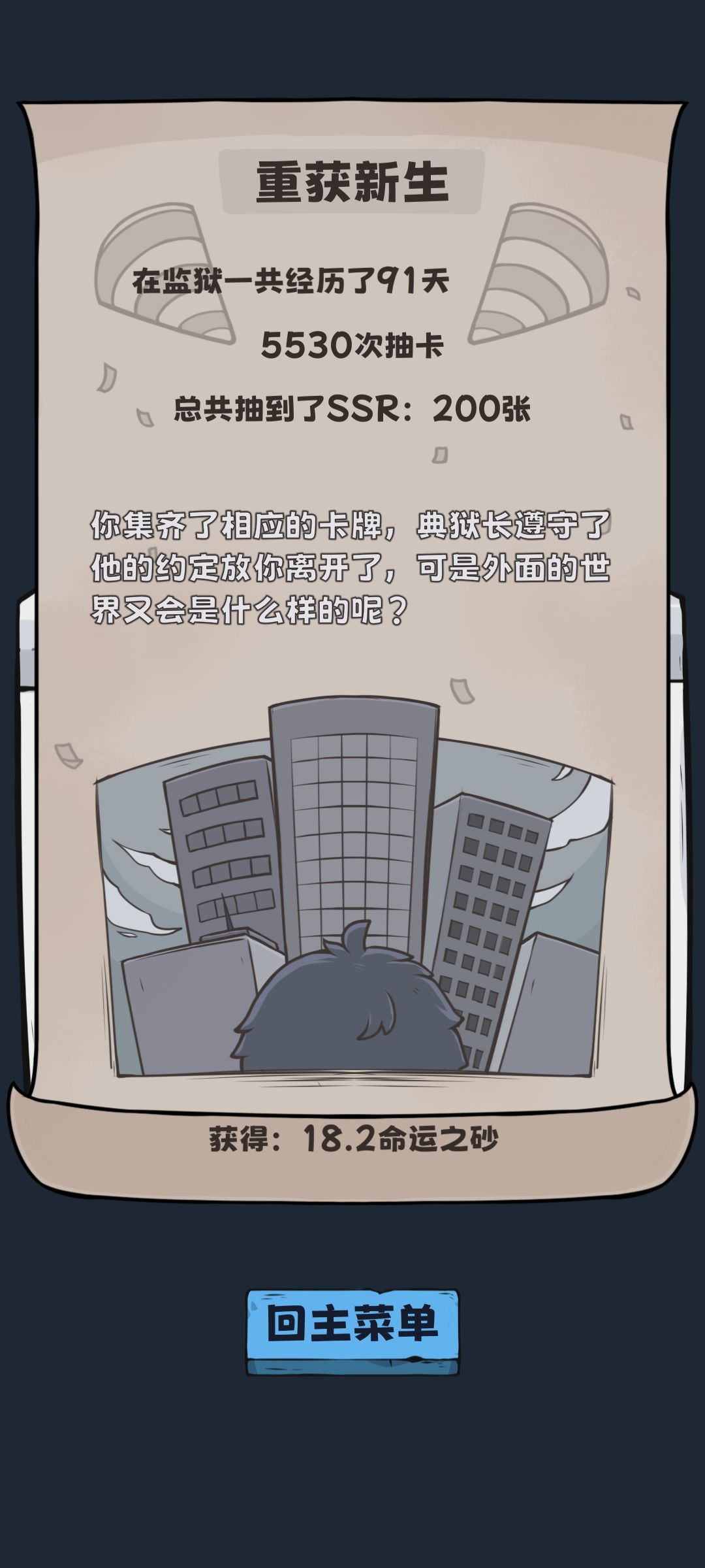 1.先看三个广告开畅玩卡,欺诈师,催眠师。(好像是bug,200砂平时几十个广告都凑不出来)。欺诈师进游戏,天赋随意,直接跳过到第五天和典狱长借900,抽光,五天后典狱长要债选一张不还。关9天出来,你又可以薅典狱长羊毛,注意SSR不要超过10张,会自动还款。SSR多了借给赌鬼,狱警次日跑来告诉你赌鬼出狱,点赌鬼留在位置上的信,达成活菩萨成就。赌鬼跑路之后SSR去交换,交换什么无所谓,只要一直老赖就