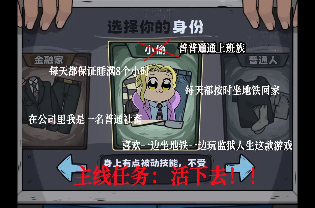 我叫小帅,今年18岁。在公司里我是一名普通社畜。每天都按时坐地铁回家。喜欢一边坐地铁一边玩监狱人生这款游戏。每天都保证睡满8个小时。就在今天我醒来发现我被抓到监狱里了?还通知我只有100天活头了必须攒满100张ssr卡才能活命。也没有别的办法了只能了解监狱里的生存规则了。游戏属于模拟经营。在监狱里首先是时刻关注自己的状态。状态太低就会嘎掉。不同阶段的状态也会有不同的buff。在监狱里主要是抽卡生存