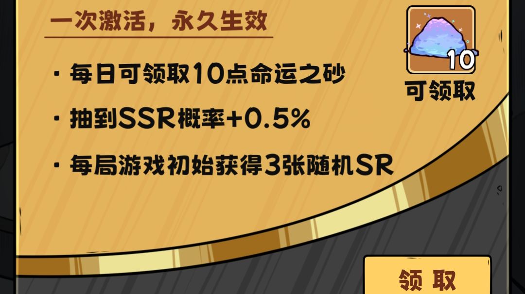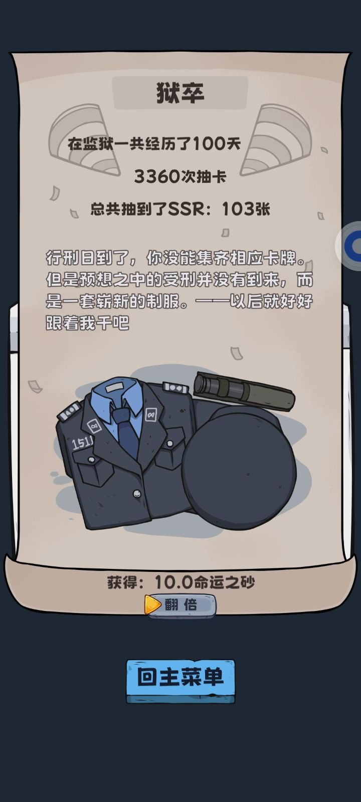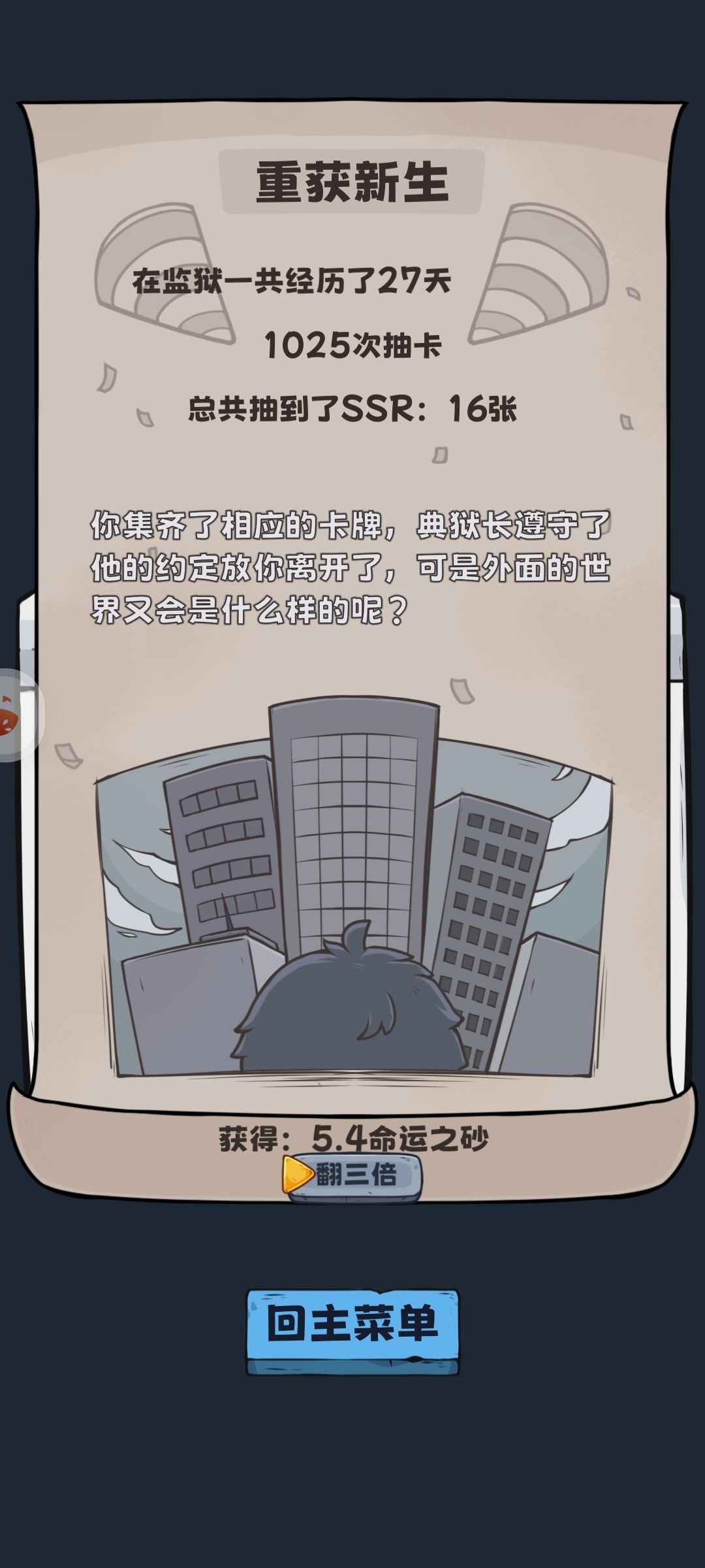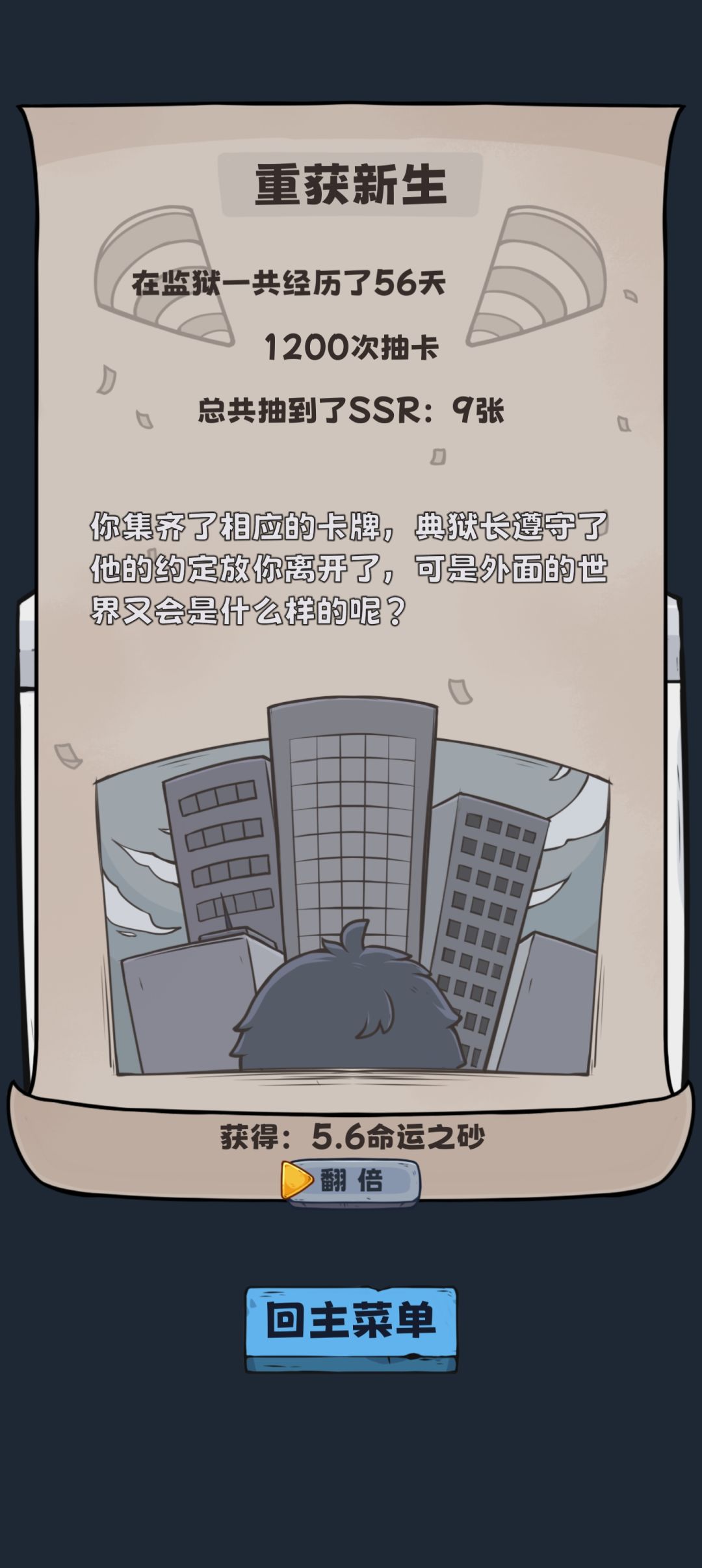 一、对游戏的评价 之前没玩过抽卡人生,就不对比两款游戏了,个人觉得本作挺有意思。 二、游戏攻略 这么快通关主要是游戏版本更新后居然免广告了!!!(很快就修复了) 1、不要想着开始什么都没有就通关,先刷命运之砂 2、刷命运之砂流程,进去以后不断点击下一关,死亡后看广告拿三倍砂,刷到一两百砂以后卡牌强化ssr概率到7.9%,然后改变刷砂思路,等第六天监狱长出来,贷款1000,然后抽卡,抽10次后不断点