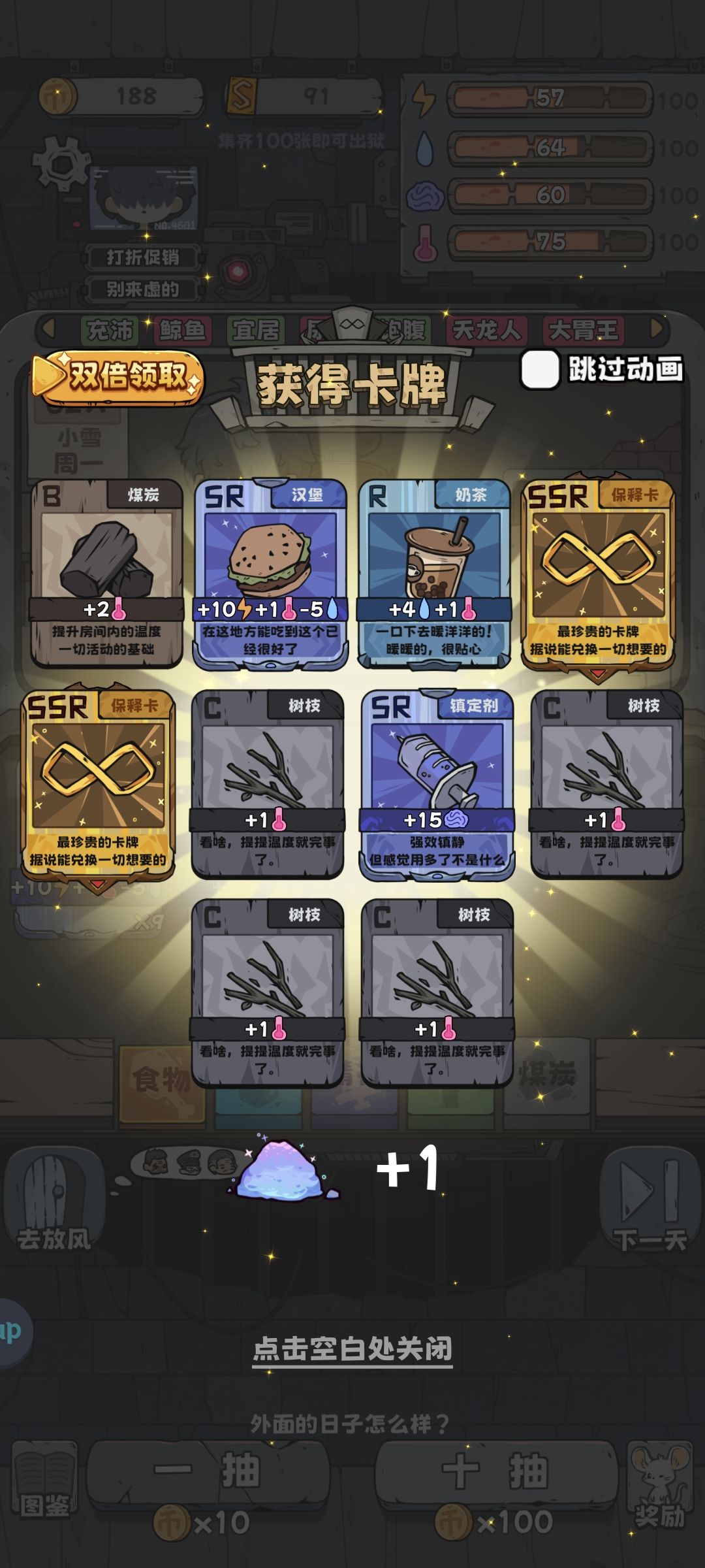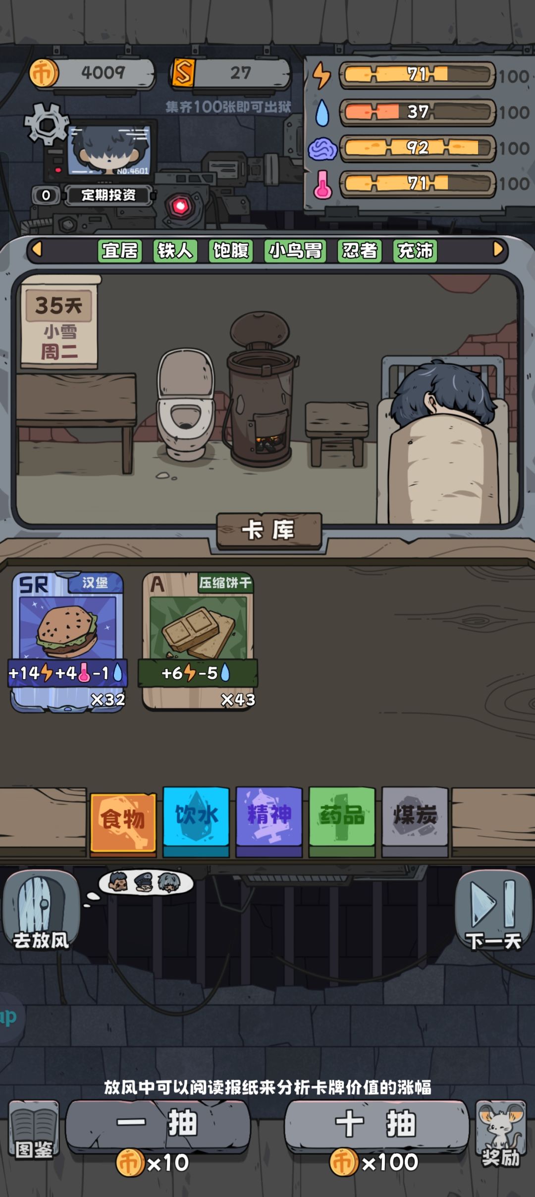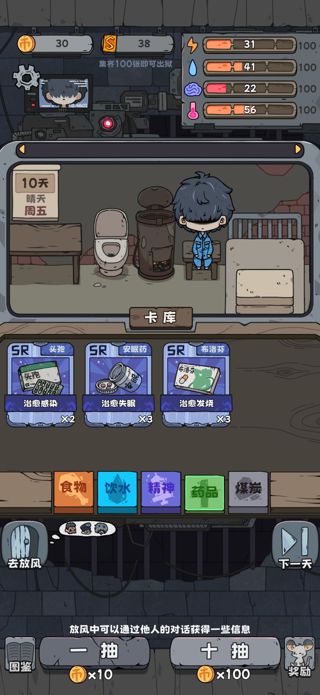 #浅评一下 #抽卡监狱 这是一款以抽卡为主的生存游戏,你必须在100天内收集100张SSR保释卡来成功出狱。有多种模式和角色供你选择,可以通过完成一局游戏来获得砂来升级你的角色和卡牌属性来降低游戏难度或者丰富游戏内容。 开局会选择两个buff和两个debuff,普通模式下(这里我选择的是盗贼)每日会分发100信用点,可以来一发十连来抽取每日所需的物资,至于抽到什么物资取决于你的欧气。通过抽取