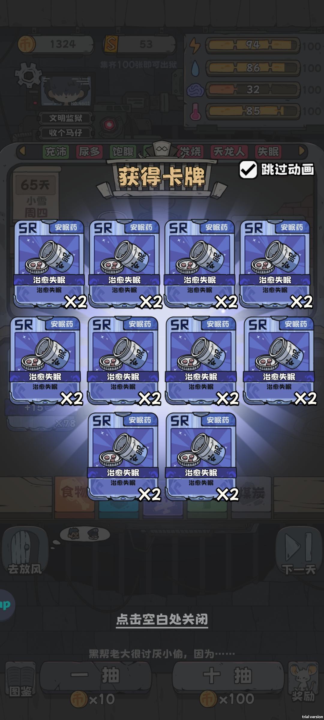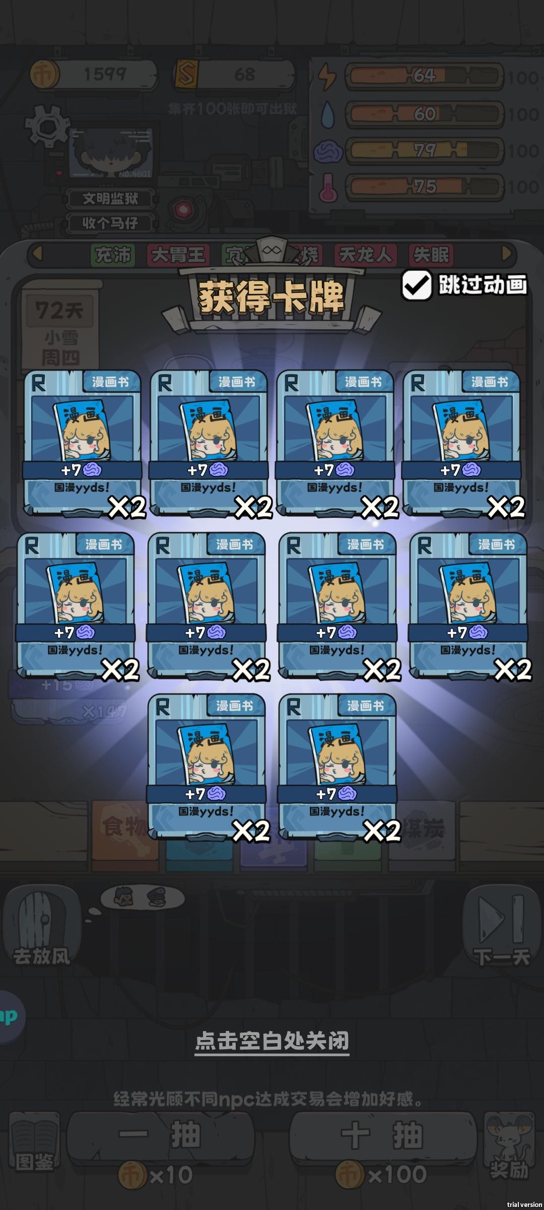 1.开局直接找黑帮老大捶死你5次2.精神崩溃5次3.渴死5次以上三项加上3倍广告,大概十分钟左右就可以拿到几百命运之砂4.用命运之砂猛升卡牌,主要升sr和ssr卡牌的概率(升满大概随机10次-20次随不出来了为止)职业真是一点用都没有5.猛升卡牌价值,无论什么卡牌只要是价值就猛升6.这个时候基本就可以实现抽100卖100的永动机了7.找典狱长借1000开始永动机 大概来回卖个十几次就