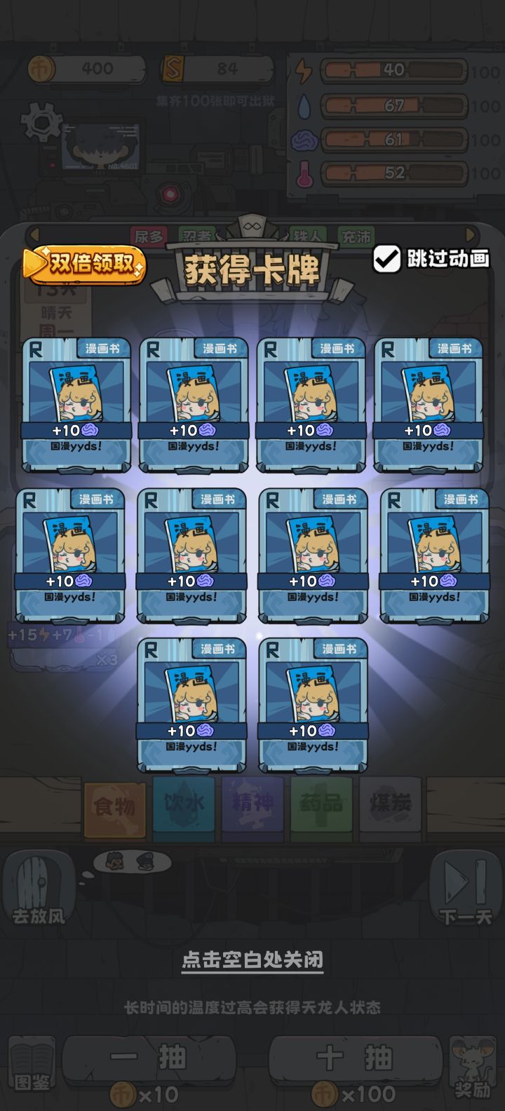 1.先看三个广告开畅玩卡,欺诈师,催眠师。(好像是bug,200砂平时几十个广告都凑不出来)。欺诈师进游戏,天赋随意,直接跳过到第五天和典狱长借900,抽光,五天后典狱长要债选一张不还。关9天出来,你又可以薅典狱长羊毛,注意SSR不要超过10张,会自动还款。SSR多了借给赌鬼,狱警次日跑来告诉你赌鬼出狱,点赌鬼留在位置上的信,达成活菩萨成就。赌鬼跑路之后SSR去交换,交换什么无所谓,只要一直老赖就