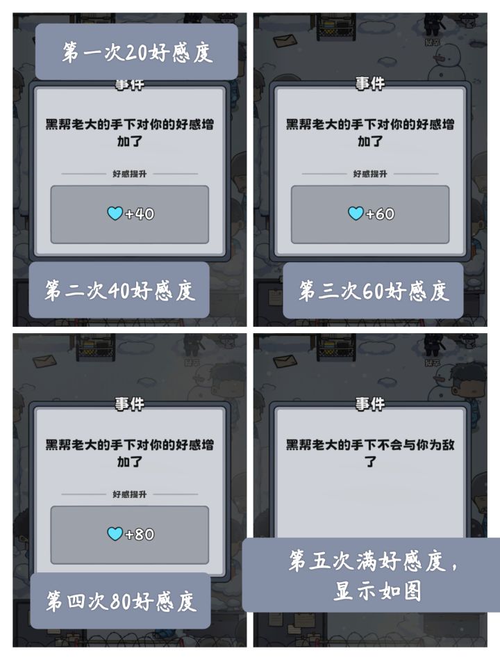 条件:1.监狱长满好感度2.黑帮老大0好感度3.小偷满好感度(隐藏条件)4.黑帮老大的小弟满好感度(隐藏条件)注意事项:交易市场里面,小弟是根据小偷好感度分阶段出场的(推测),小偷好感度不够就很难刷出小弟的四块煤炭(小偷好感度四星半时,刷出小弟80好感度的煤炭交易;小偷满好感度,刷出小弟100好感度的煤炭交易)小弟煤炭交易不好刷,一次交易,我都把阿杰重随出去三次才刷出来小弟的煤炭
