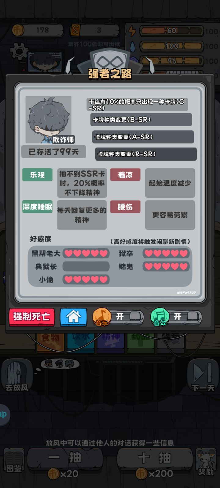1.先看三个广告开畅玩卡,欺诈师,催眠师。(好像是bug,200砂平时几十个广告都凑不出来)。欺诈师进游戏,天赋随意,直接跳过到第五天和典狱长借900,抽光,五天后典狱长要债选一张不还。关9天出来,你又可以薅典狱长羊毛,注意SSR不要超过10张,会自动还款。SSR多了借给赌鬼,狱警次日跑来告诉你赌鬼出狱,点赌鬼留在位置上的信,达成活菩萨成就。赌鬼跑路之后SSR去交换,交换什么无所谓,只要一直老赖就