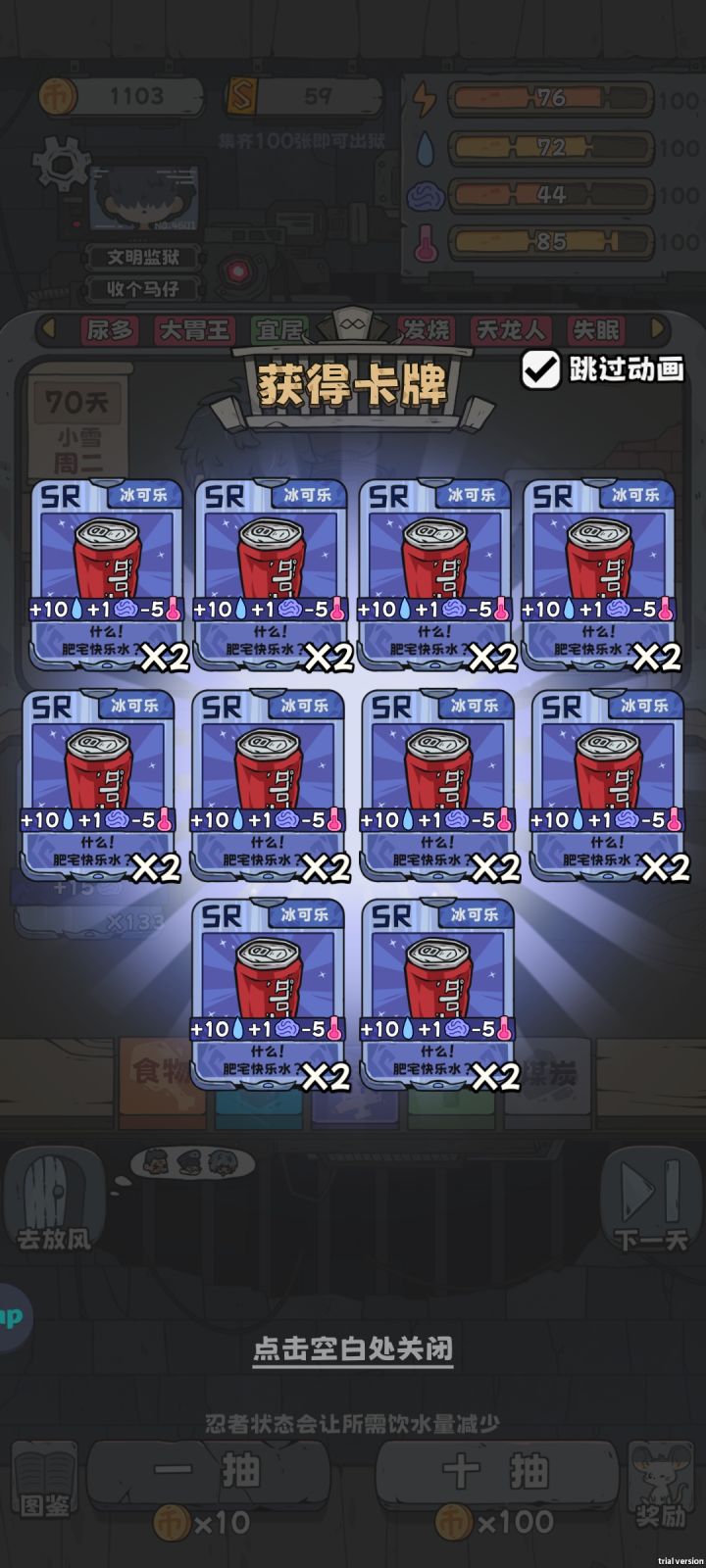 全都拉满了,洗白白等捞最欧的一次八个煤,嘎嘎舒服——————————————————————人物背景以及对话线索分析赌鬼纯赌狗不谈,SSR卡疑似于时间强关联,可能是可以可以兑换时间小偷人物背景有点肖申克内味了,不过是给狱警打工的,从狱警的对话中也能得到一些线索。狱警指桑骂槐利用敛财且包庇小偷,不过好像惹不起黑榜大哥黑榜大哥重情重义好大哥,为了妻儿拼命挖煤。外面的世界才是真正