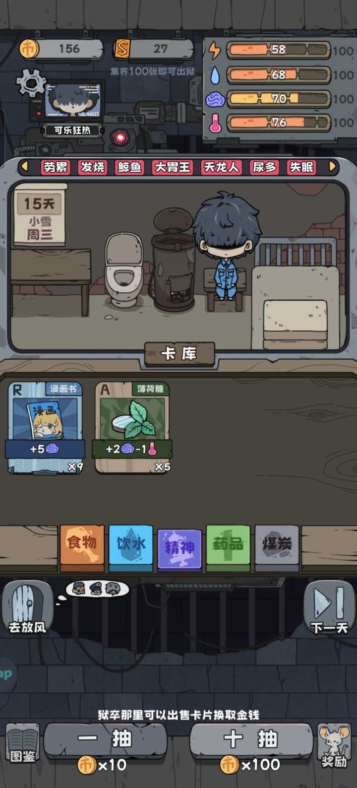 全都拉满了,洗白白等捞最欧的一次八个煤,嘎嘎舒服——————————————————————人物背景以及对话线索分析赌鬼纯赌狗不谈,SSR卡疑似于时间强关联,可能是可以可以兑换时间小偷人物背景有点肖申克内味了,不过是给狱警打工的,从狱警的对话中也能得到一些线索。狱警指桑骂槐利用敛财且包庇小偷,不过好像惹不起黑榜大哥黑榜大哥重情重义好大哥,为了妻儿拼命挖煤。外面的世界才是真正