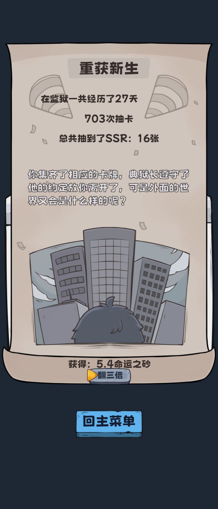 感谢闻人大佬的攻略,终于完成八个结局了(结局一和结局二是极速模式完成的)。个人觉得最难的就是结局七了(不能找典狱长借钱,不能烧炭,直接玩成广告模拟器),其他都还好