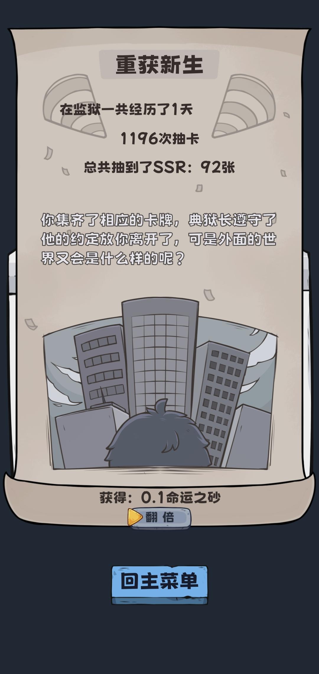 感谢闻人大佬的攻略,终于完成八个结局了(结局一和结局二是极速模式完成的)。个人觉得最难的就是结局七了(不能找典狱长借钱,不能烧炭,直接玩成广告模拟器),其他都还好