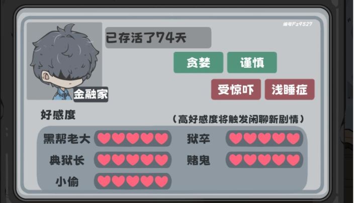 全都拉满了,洗白白等捞最欧的一次八个煤,嘎嘎舒服——————————————————————人物背景以及对话线索分析赌鬼纯赌狗不谈,SSR卡疑似于时间强关联,可能是可以可以兑换时间小偷人物背景有点肖申克内味了,不过是给狱警打工的,从狱警的对话中也能得到一些线索。狱警指桑骂槐利用敛财且包庇小偷,不过好像惹不起黑榜大哥黑榜大哥重情重义好大哥,为了妻儿拼命挖煤。外面的世界才是真正