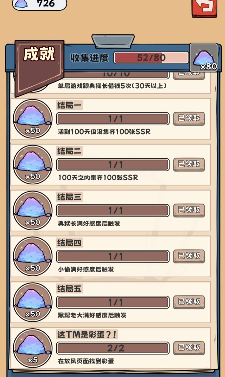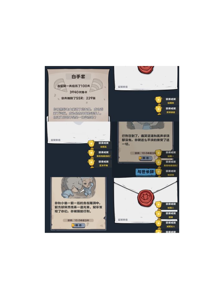 感谢闻人大佬的攻略,终于完成八个结局了(结局一和结局二是极速模式完成的)。个人觉得最难的就是结局七了(不能找典狱长借钱,不能烧炭,直接玩成广告模拟器),其他都还好