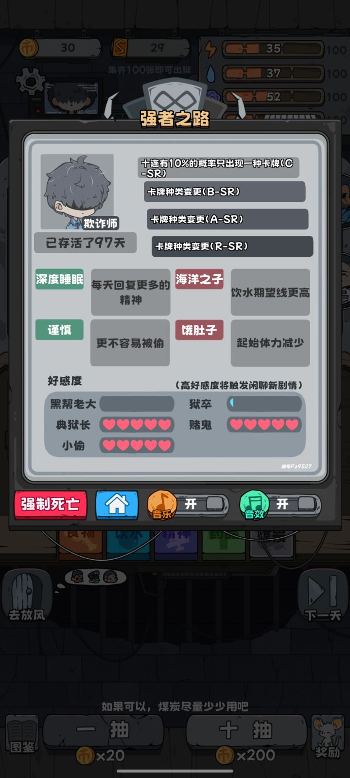 全都拉满了,洗白白等捞最欧的一次八个煤,嘎嘎舒服——————————————————————人物背景以及对话线索分析赌鬼纯赌狗不谈,SSR卡疑似于时间强关联,可能是可以可以兑换时间小偷人物背景有点肖申克内味了,不过是给狱警打工的,从狱警的对话中也能得到一些线索。狱警指桑骂槐利用敛财且包庇小偷,不过好像惹不起黑榜大哥黑榜大哥重情重义好大哥,为了妻儿拼命挖煤。外面的世界才是真正