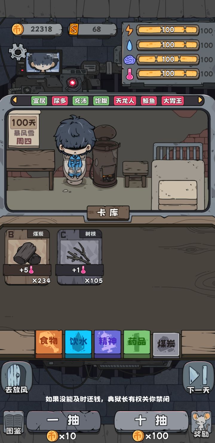 得弄总共2000张煤炭卡和黑老大买东西(多了几个不加好感减了几个也不加最好就是凑整数10个+1好感),除典狱长外其他人好感度全拉满,后面的几天暴动会一直掉卡也不能出去,所以最后阶段留点卡别死了,最后触发暴动结局……嘶……这游戏有点意思