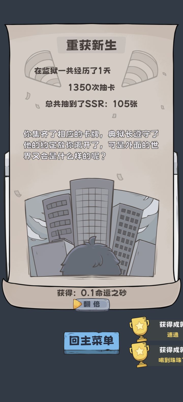 新手玩家如果不想被折磨的话,可以尝试一下这个玩法。第一步折磨主角刷成就拿命运之砂。①主角有四个条值,体力条,水份条,精神条,温度条。这四个都有对应的成就“饿死”“渴死”“发疯自杀”“冷死”。②砍黑帮老大的价格,被他打死。成就“被打死”③黑帮老大的物品刷新,每局都去花一砂刷新。成就“今天的货不行”△仅上面的6个成就,加上广告的三倍。半小时内就可以刷到上千命运之砂。第二步用命运之砂刷新卡牌