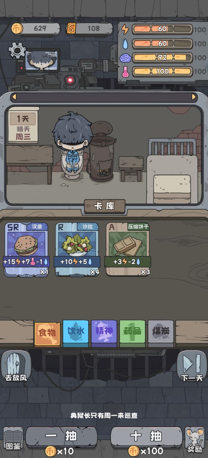 全都拉满了,洗白白等捞最欧的一次八个煤,嘎嘎舒服——————————————————————人物背景以及对话线索分析赌鬼纯赌狗不谈,SSR卡疑似于时间强关联,可能是可以可以兑换时间小偷人物背景有点肖申克内味了,不过是给狱警打工的,从狱警的对话中也能得到一些线索。狱警指桑骂槐利用敛财且包庇小偷,不过好像惹不起黑榜大哥黑榜大哥重情重义好大哥,为了妻儿拼命挖煤。外面的世界才是真正