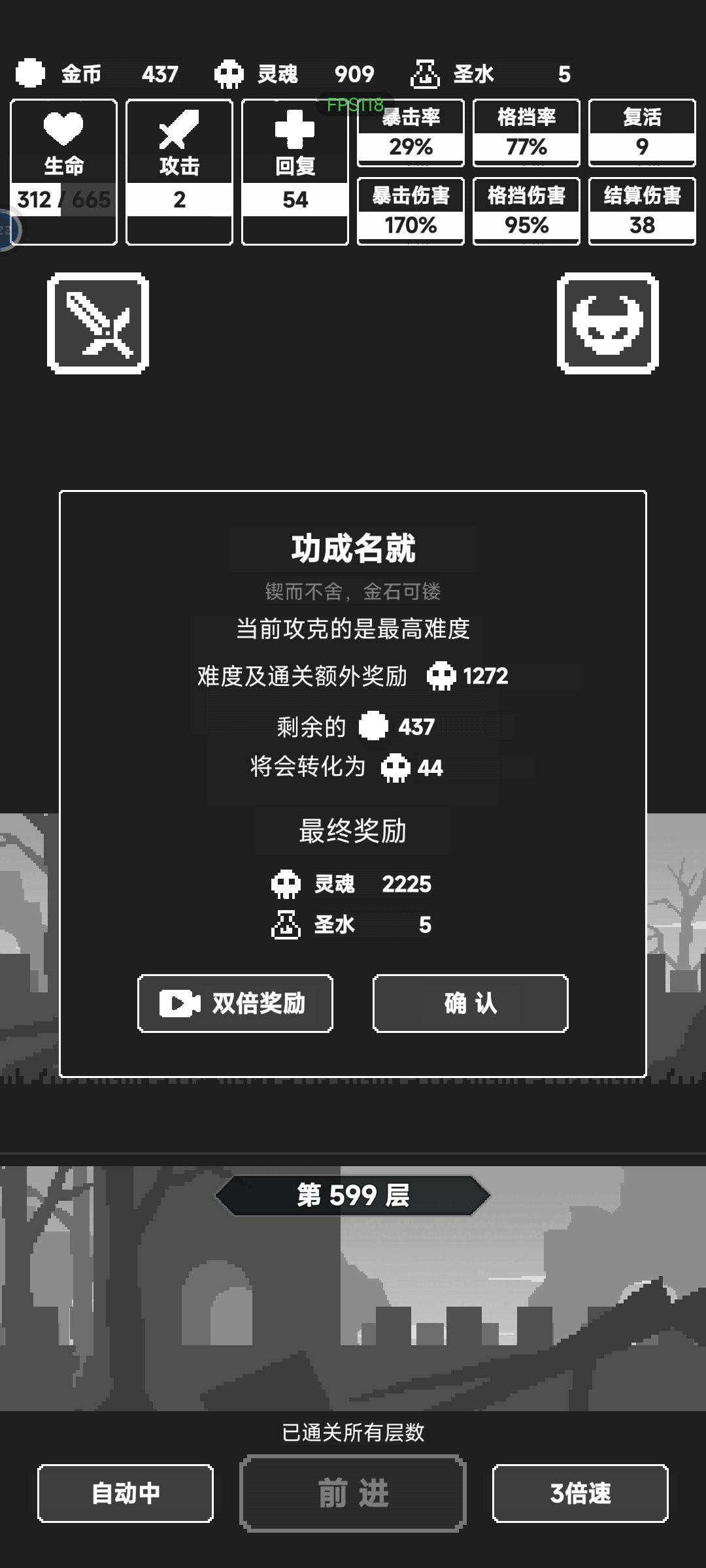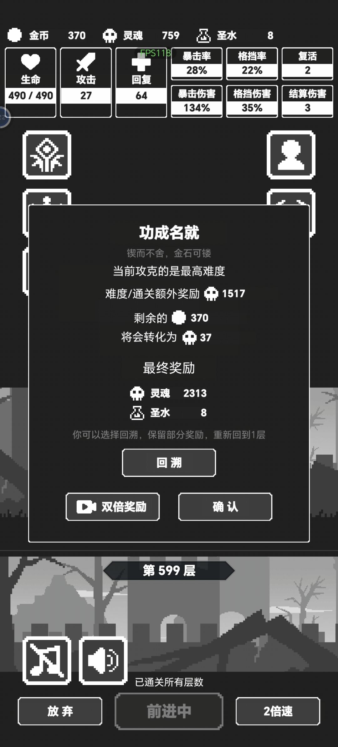这游戏怪物到boss只有一种输出手段,平砍!!!于是格挡流直接无敌。钱都买格挡,中期没成型怕死血量买到200就够了,后期直接不掉血。 前期200前,找核心三盾!!!护心镜,护身符,黄金盾。 中期过度。各种伤害圣物和一到两个回血圣物。不要买太多伤害圣物!!!多了影响核心圣物的升级。暴击直接不要!!!这游戏的基础攻击力太难获取了。 后期500层。后有双90到双一百的格挡率和格挡伤害,躺过boss。#攻略