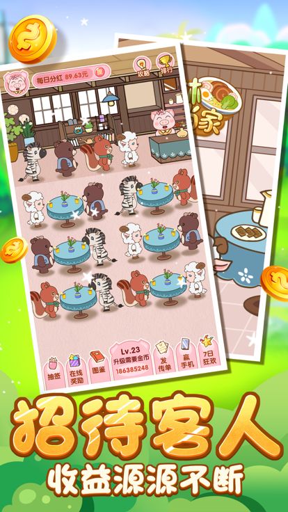 你可以雇佣可爱的动物员工为你工作,迎接食客进店,并点击他们获得收益!
