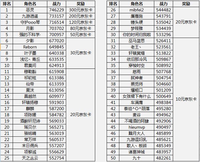 【《天际奇兵》战力大比拼 京东卡免费拿】获奖名单