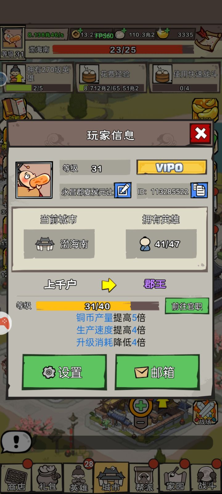 主要玩法就是一个城池里有n个商铺,升到指定等级完成主线任务就开启下个城池,如此反复