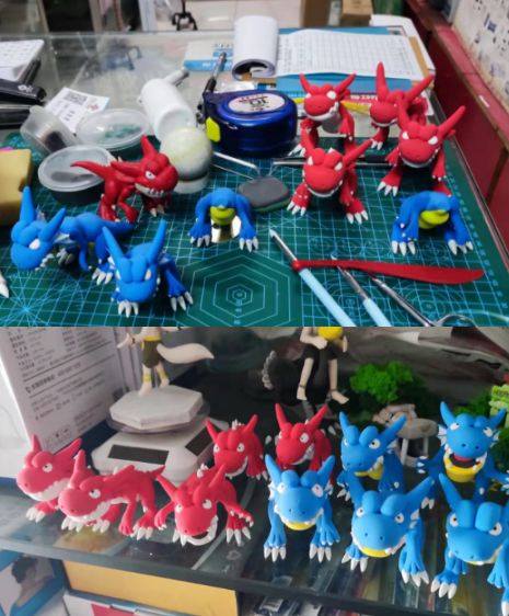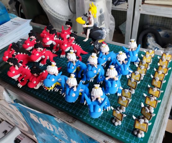 最近一直在筹划做点什么新的黏土手办来记录在新石器时代15区认识的人和事,于是决定干票大的,给游戏里的伙伴们一人做一套石器里面的经典造型---小豆丁骑暴龙!先从暴龙的身体和人物的四肢开始做,工程量巨大.....制作的过程太麻烦了....经常白天埋头做,一抬头,天就黑了......在制作的过程中也在不断地和游戏中的好友们分享制作过程,一开始计划做6只蓝暴和6只红暴就差不多了,后来想要的人越来