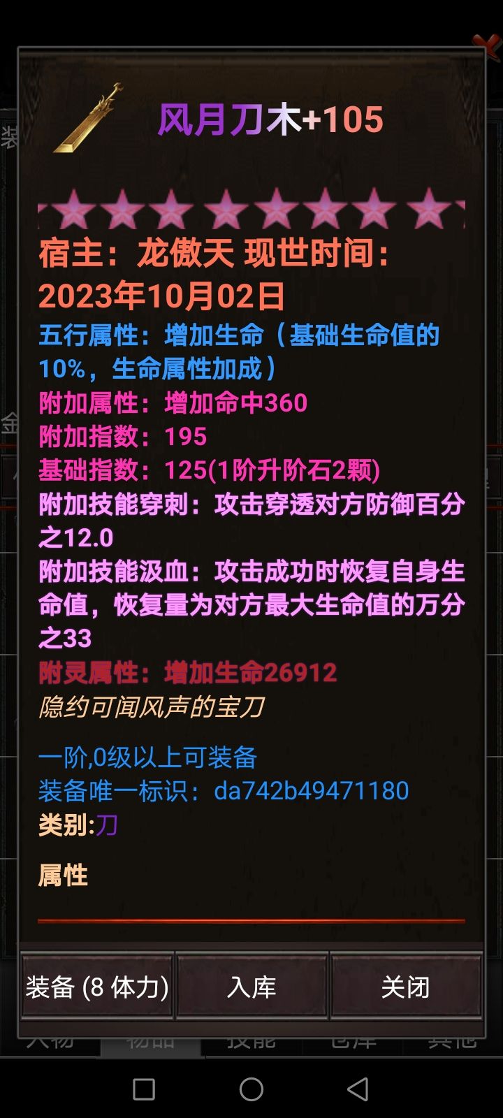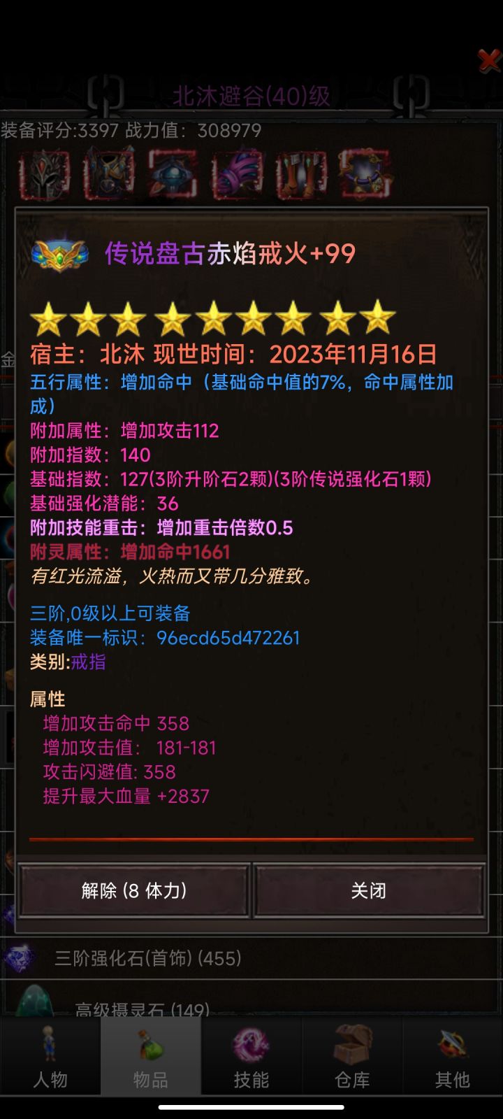3.首先为萌新解释下什么叫极品属性,从三阶装备开始,90+装备可能会出现三个词条:附加指数,基础指数,潜能。以双刀为例子,防具火闪闪为最佳,火为五行属性加命中,第二个闪为附加属性闪避,第三个闪为附灵属性闪避,优先选择顺序为-五行属性-附灵属性-附加属性,五行属性只要是金火都可以用,而附灵和附加就要看数值高低了,怎么看呢?三阶装备附加指数最高190,165就可以用,有人就问了不到165就不能用吗?可以用,但前提是你的附灵指数+潜能要高,三阶最高160(但本人出过163的项链),不知道算不算系统bug,差值5以内为极品,也就是说155就算是极品属性,就算附加属性不高也可以用的,因为附灵+潜能影响你的附灵属性和下面的三维属性,越到后期越明显!最后建议在升阶装备前先强化满!切记!!!