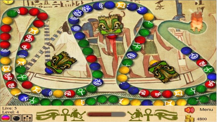 你需要控制古埃及法老的骷髅头骨,将新的魔术球吐射到球链上,使得形成三个或以上连续的相同颜色的球组以消除这些球;