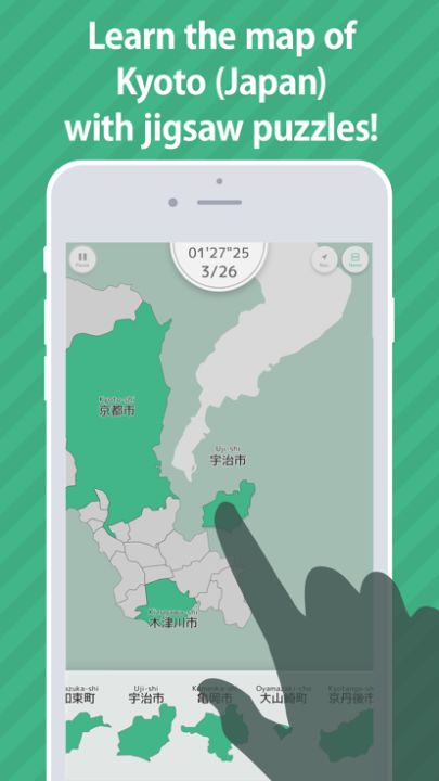 Memorize the cities of Kyoto (Japan) through jigsaw puzzles in this educational game focused on enjoyment and good pacing.