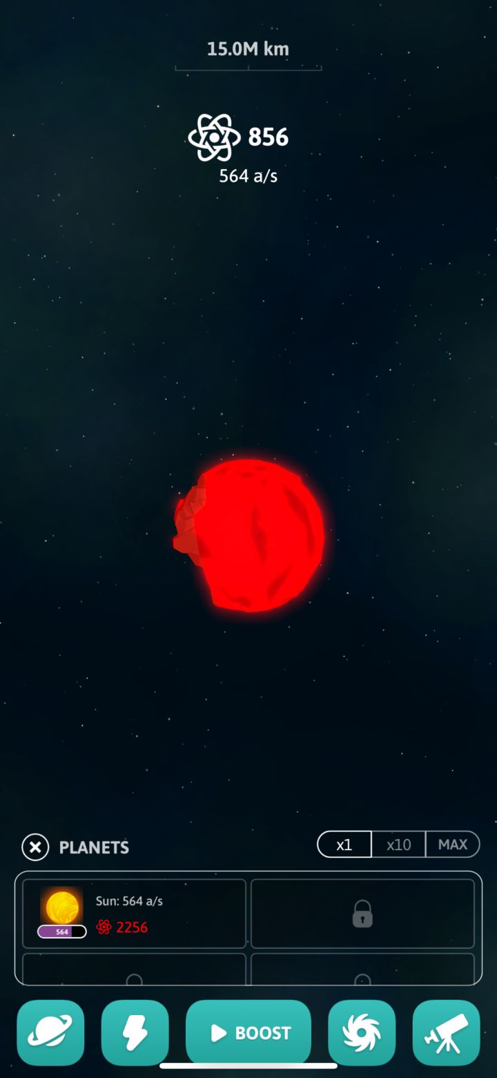 点击放置类游戏,以宇宙为题材,不过估计包含的也就太阳系。有转生选项(黑洞),基本是这类游戏的标准模板,没太多特色。