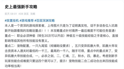 #百层深渊游戏攻略 本人也是新手,说说走过的弯路和看到的攻略。 首先进游戏刷普通难度,不用急着往前面打。刷点遗产等解锁盗贼,牌子先换神器多余的换等级丹,因为前期不需要潜力果,宝石需求也不高,然后宠物的话就用凯撒大帝。彩钻的话先买宝石孔和挂机,解锁盗贼遗产够1w以上了就可以打中等,天赋优先把初始金币点到60级,自动加点改成幸运,宝石全带幸运宝石,一定要转职神偷之后再点怪物遗产批量获取,优先把神偷技能