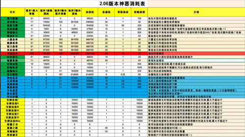 2.06版本神器消耗表