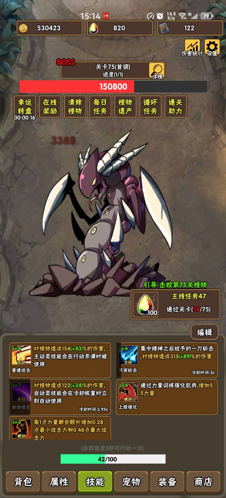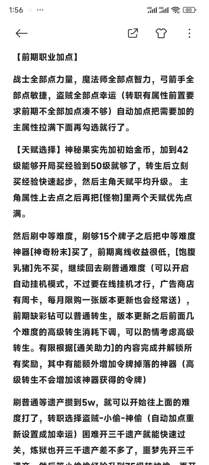 开局先进群领免费的特权卡,广告卷和通用经验都会有双倍收成。【首要任务】先跟着任务做,就能完成第一次转生,任务送的汤不要用,然后刷普通难度20次,抽亡灵武士,把汤喂给它然后带上,每次转生就能多一个牌子了(宠物到这里就结束了,接下来都不用管宠物),遗产先不要用,留着给小偷。【前15转】职业选剑士,需要手动点击屏幕,也可能开点击器点,花1000钻买通用技能淬毒,然后钻石留着买9999钻石的光之剑,1