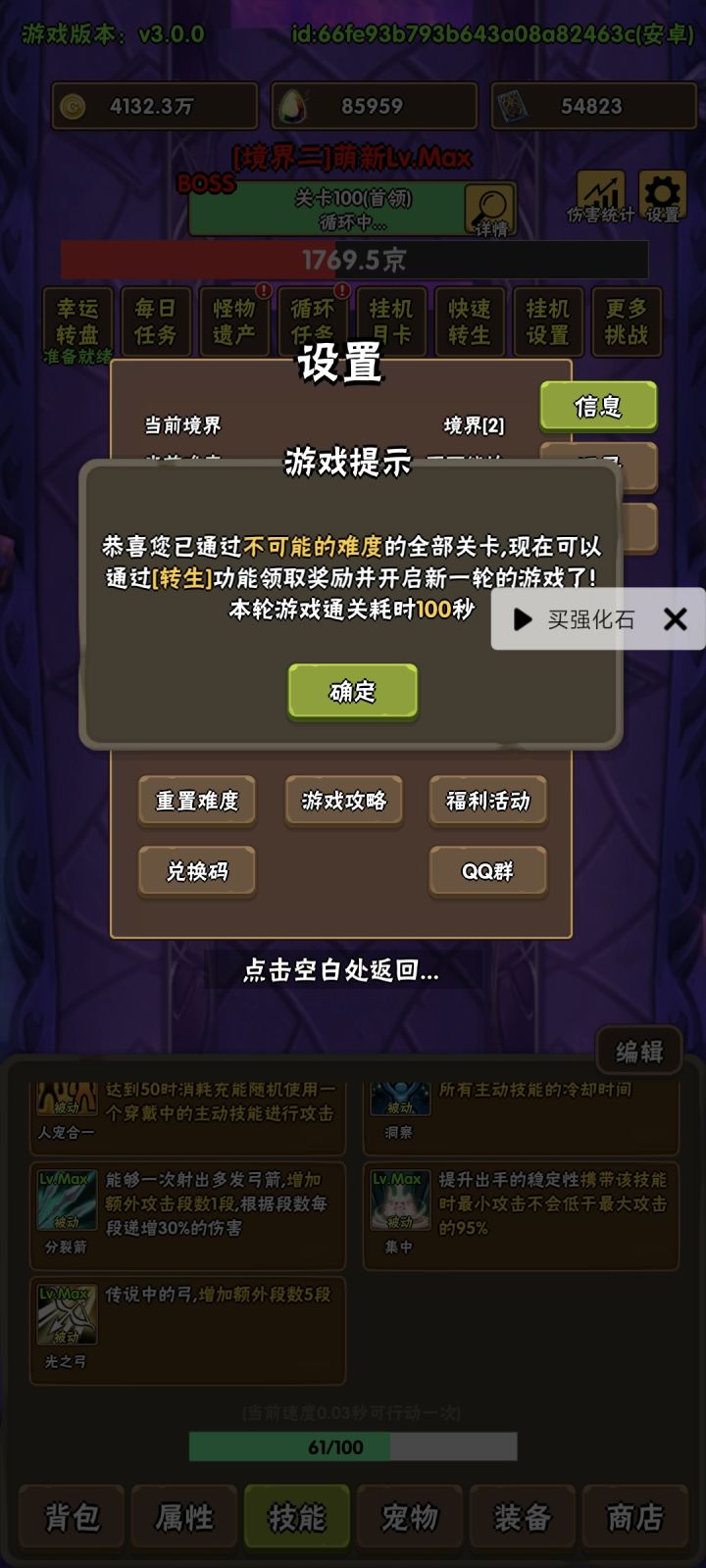 必备条件:1:称号不可能2刷满,战士专精1,不需要额外转生次数!定制党福音。2:定制词条、定制6宠,6宠按群里推荐的双天赋属性拉满。3:挂机设置购买潜能点去掉,等级201级,开花选洞察,分裂剑,集中,光之弓,录制买强化石的点击器。具体操作:1:先打一次不可能2,转生后立即拉满潜能。2:商店用点击器买强化石,强化头盔打完97层可以强化到219级。3:等通关。差3秒以内的,多打几次可能过。另外:非