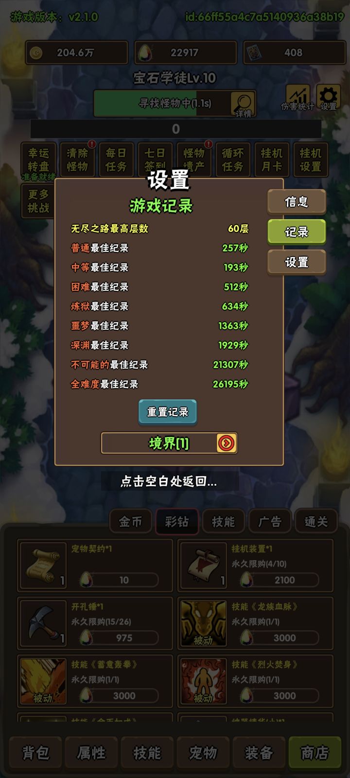首先,本游戏十分上头,十分上头,目前单机游戏我认为唯一值9.9分的游戏,下面进入正题。1,前期,中期,后期个人划分。游戏1-3天为前期,4-20天为中期,20天后为后期。前期主要目标是通关难度到深渊,解锁各难度有用神器;中期则是升级宝石,强化幻化,装备升星等初步提升,初步具备打不可能难度的能力;后期是在中期基础上提升全面属性,创造更好的通关记录。2,关于游戏特色,新玩家需要知道本游戏的核心是用