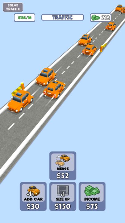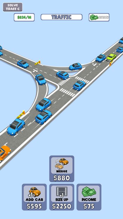 Create cars and merge tem to better cars for more money. Reduce traffic by merging and create traffic again
