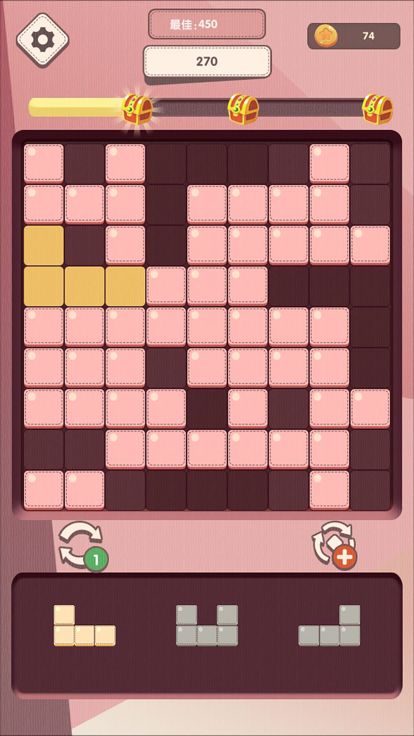 玩家通过移动底下的三块方块,放到场景上。满足行向或者纵向或者正方格里9块即可消除。可以通过消除积累分数获得宝箱,宝箱里有旋转道具可以旋转方块。玩家还可以通过金币购买旋转道具和刷新道具