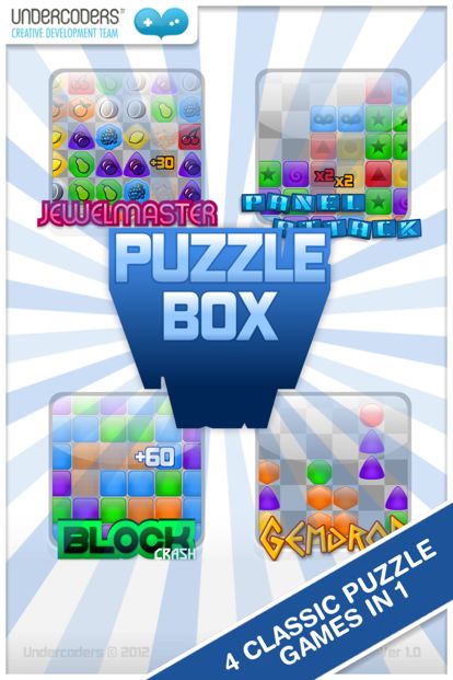 Welcome to Puzzle Box, a collection of 4 classic puzzle games with high detailed iPad retina display graphics, touch-screen based controls, different game modes, Game Center Leaderboards and tons of Achievements to unlock!