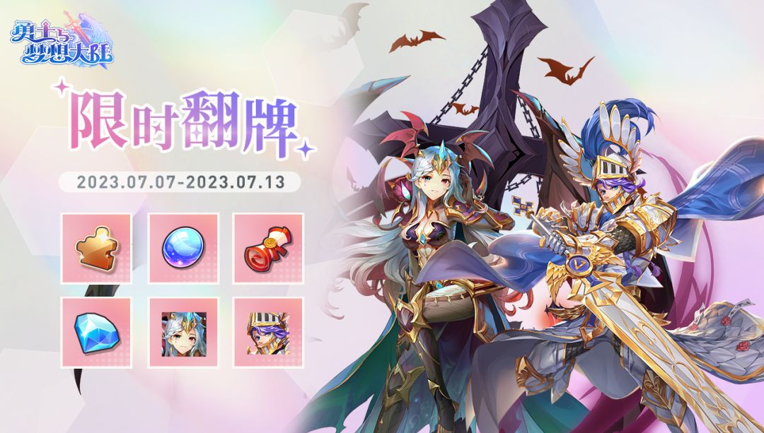 亲爱的勇者大人: 塞拉来播报最新的活动啦~ 全新的幸运有约活动“限时翻牌”将于7月7日开启! 拼手气的时刻到啦!准备好兑换SSS+英雄了吗~ 1)限时翻牌。在活动期间参与我们全新的幸运翻转活动即可获得丰厚奖励。 积累翻转积分可以帮助你解锁新的SSS+英雄多蒙和若拉! 2)每日登录。每日登录即可免费领取2张翻牌券!翻转券还可以通过每日登录、每日充值、限时礼包、限时消费等方式获得。 3)限时钻石消耗奖
