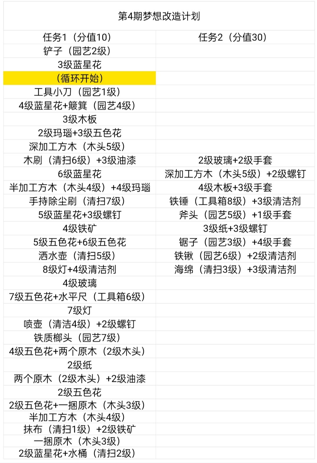 不出意外是收官这期了 发射器还上千次但是体力不够用了 第六期我一定要多攒点纸和木头和蝴蝶再进[表情_捂脸哭] 附上第五期梦改的材料图 左边是刷新顺序 右边是一轮所需的材料总和 有需要的自提 祝大家都能10轮以上完美收官[表情_比心][表情_比心]#乐缤纷庄园攻略 #乐缤纷庄园攻略征集