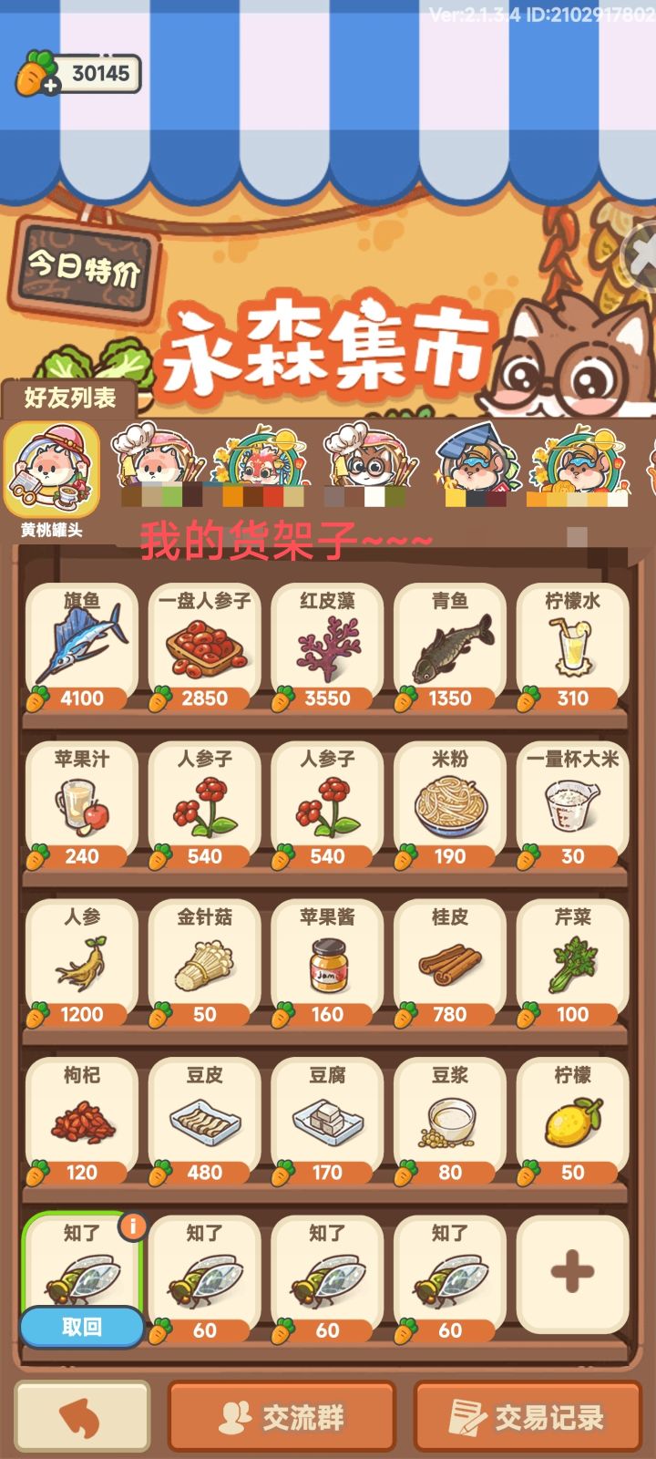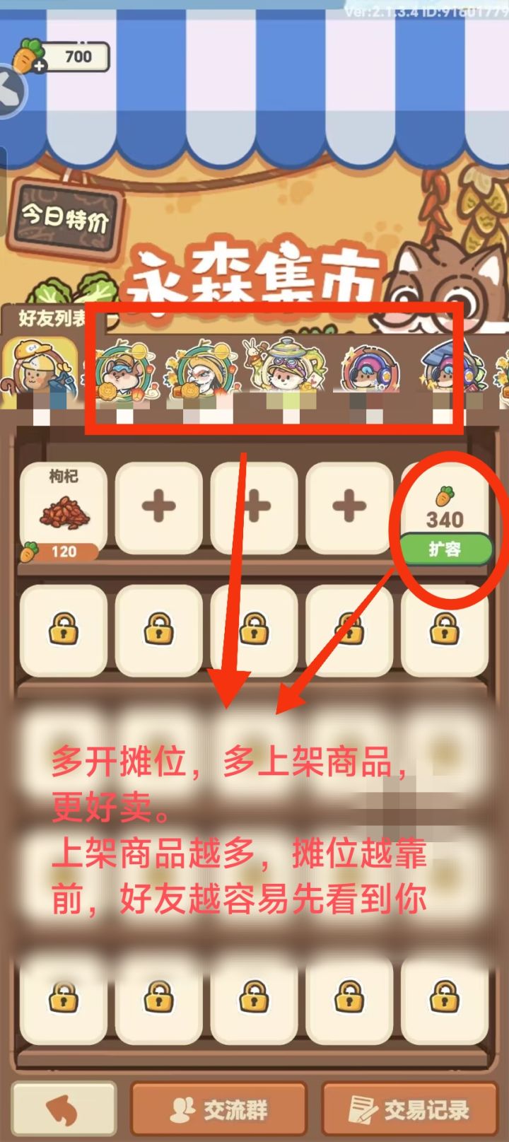 摆摊小窍门~教你白手起家~~~ ٩(¥A¥)۶1、农场集市:主线做到火锅店,中央的大锅装好,就可以开农场啦。农场的物资可以自己种植,也可以好友间通过集市买卖。2、价铬&手续费:不同物品价格如图。需要注意的是,卖方上架时,官方会收手续费(约为5%,最高50),所以不要把摊位当仓库用,也不要频繁上架下架,会浪费珍贵的萝卜币~3、摊位数量&排序:①萌新摊位有限,尽量卖些快销品回本,别放一