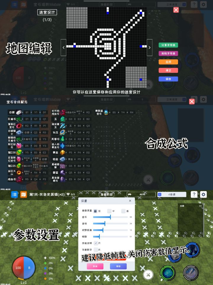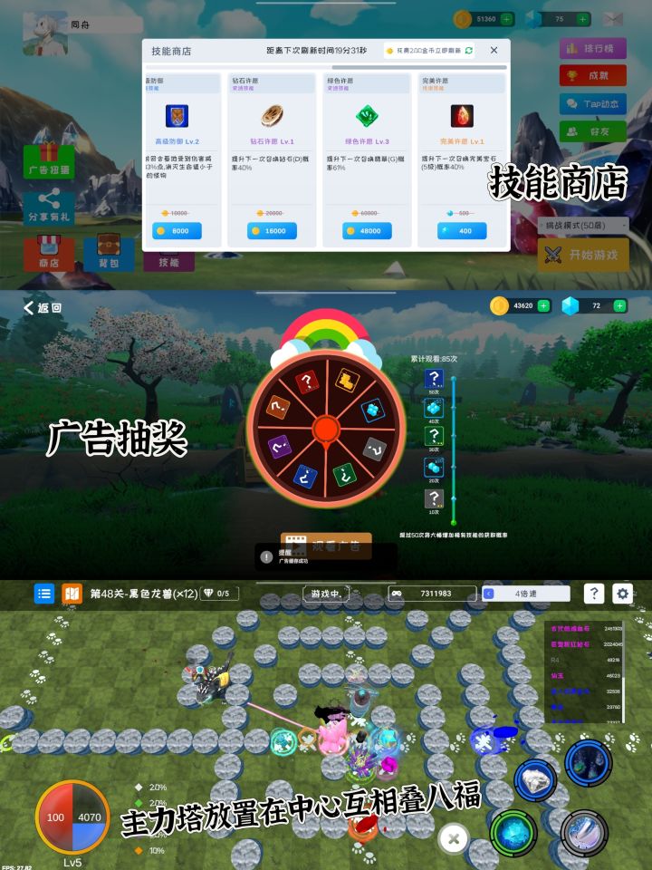自由编辑迷宫地图且带有技能养成的塔防游戏。游戏模式分别为单/双/四人,新手/挑战模式,打过挑战模式50关红龙后解锁真无尽模式,该模式下无准备阶段不可建筑新塔,目前我推到57,另外打怪可获得蓝量来使用技能。