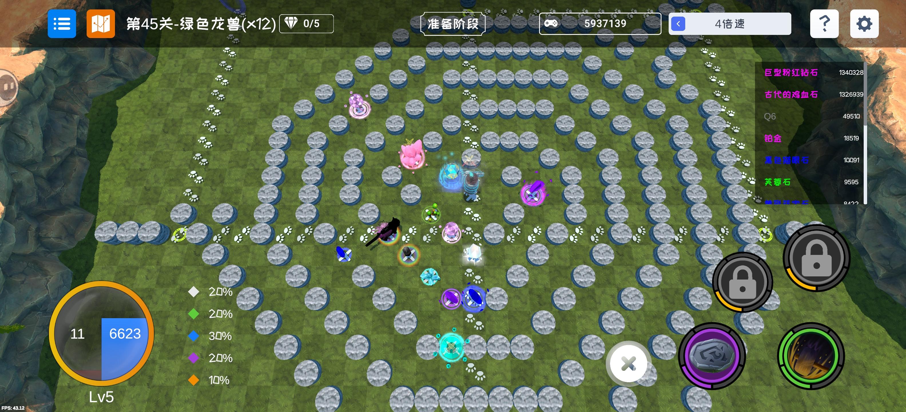 想上榜起码两个巨型红粉,也就是要四个白银,开局第第一次放宝石没有直接合白银就可以重新来了,孔雀石能直接一回合就合,不刻意要,因为235伤害太低了。10回合之前地图正中心抽奖p1,R1,R2的其中一个,把星彩红宝石的位置定下来,因为古代鸡血伤害最高,偏一个格子伤害会少10%。最高级的玉加射程一定是要升到顶的,猫眼石加攻击要有,想过50要有黄金减价和翡翠眩晕。黄彩的位置很重要,前期能把位置定在中间后面