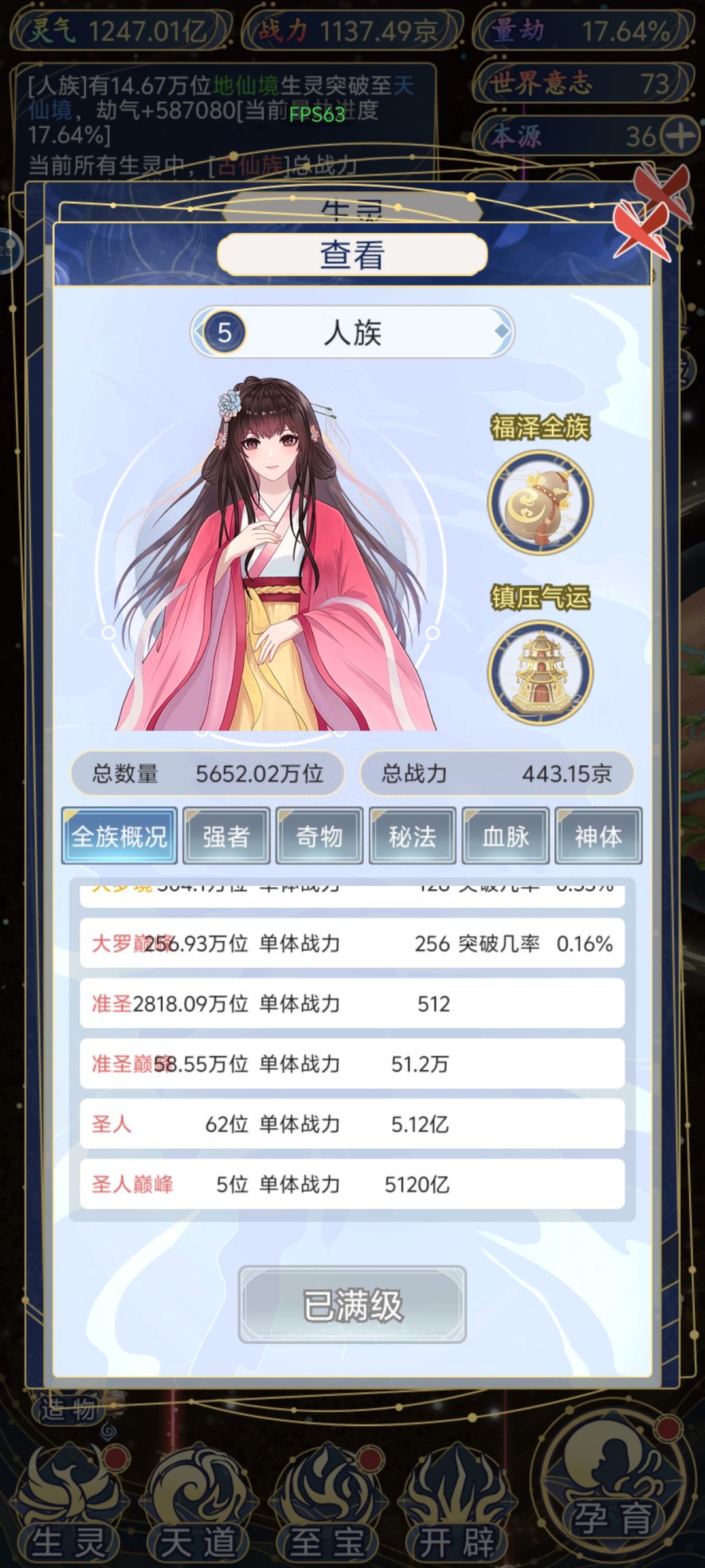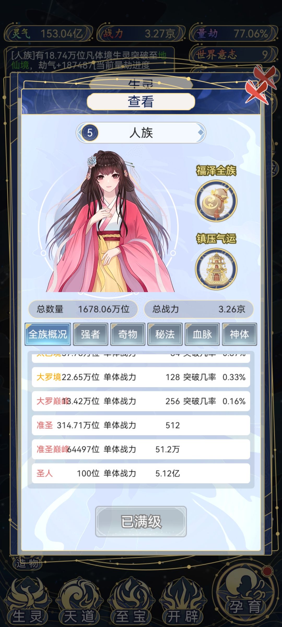 新手攻略 这游戏前期不看广告是不是玩不成? 很烦人,广告时间巨长,不小心晃一下手机就跳转微信,之前一度想卸载! 开局只选俩种族,因为资源有限,就算你看一年广告也不能面面俱到。 看图片战力,一个圣人巅峰的战力就约等于你目前世界的总战力! 所以种族越多其各种资源命中到一个种族身上的概率就越低! 因此目标就是将一个种族提升到极限就行了! 这样玩前期我就看了十个广告,攒了100世界意义,后面一路升到无垠世
