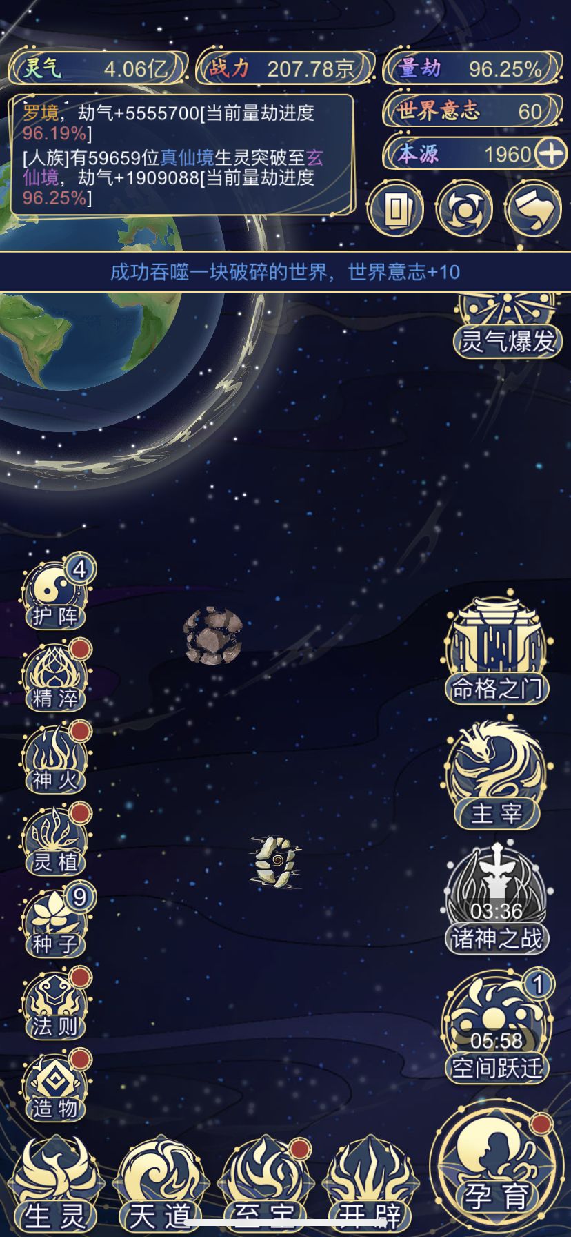劫气:点击右上角劫气可以查看当前进度和量劫次数,上限大概是100亿(道听途说)。 法则:以每10级为一个阶段,每阶段的消耗增加,满级如图,为50级。 命格之门:个人认为用处不大,大千世界和无垠世界,补获一次碎块世界都只有10世界意志,但是在无垠世界阶段,穿梭冷却更久,且补获要求是战力达到兆级单位(气运层数少的情况下,必定要有圣人,才能符合)。 但是无垠世界也有新货,比如特定种族可以吸收宇宙能量来提