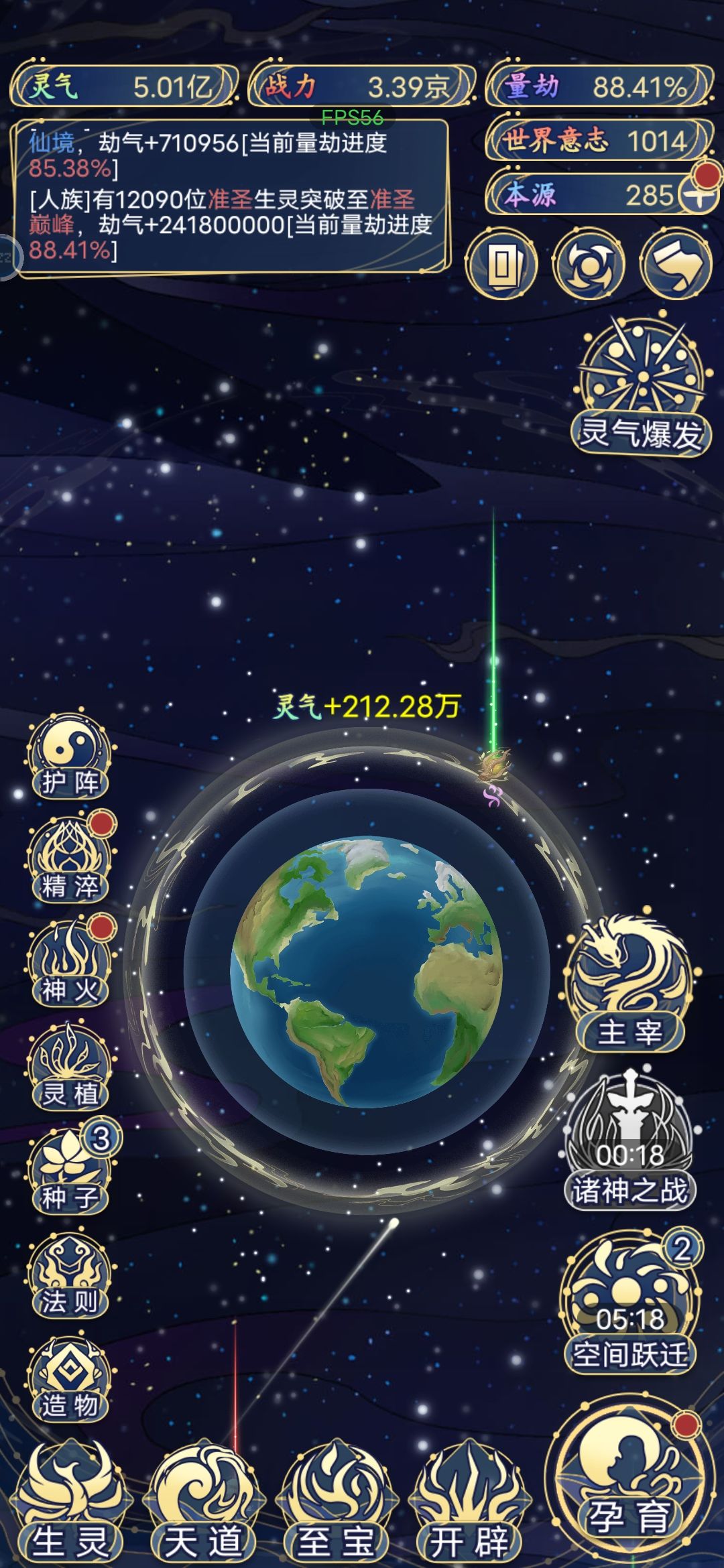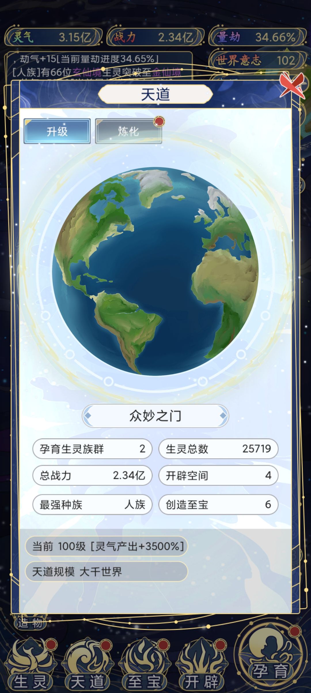 一开始不熟悉,乱玩,玩到了无垠世界,发现战力才4000亿,就删档重玩,简单说下思路吧。 (楼主后面是完了三天,玩到最后一个世界,同时还算有些合理,后面有一大堆可以升战力的,都没搞,保守估计可以轻松突破上百京) 里面的玩法就是培养生灵种族,一共六个等级。 “世界意志”:优先升级法则,然后升级天道。当规则升一级的耗费比天道升一级高时,就可以停下来,升天道了。 “神粹”“神火”“灵植”:天道等级每升一级