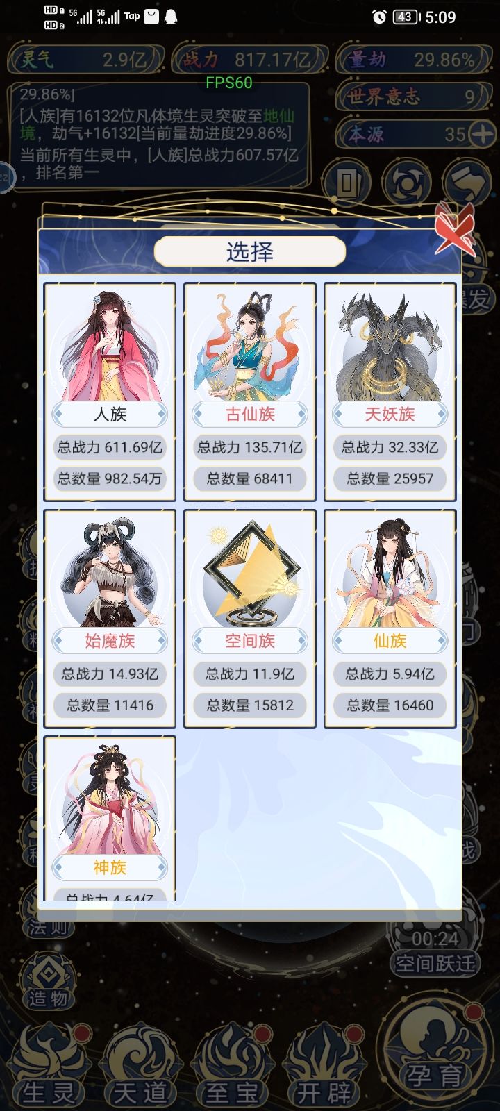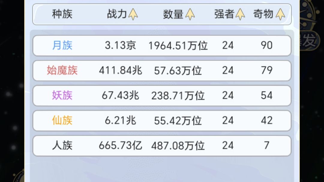 总结就是培养单人族。 前期提升战力的方法不多,所以不能抽孕育生灵,要保持单人族先把人族的血脉和大能抽到基本满级。后面就基本不需要用到灵气了。 到达能够快能开主宰劈死种族的时候,就可以开第二种族去利用种族之战攒人口,也可以不攒一直单人族,但可能战力太慢要卡一会儿战力。前期只在战力合适捡下一个世界层次的破碎世界时升级,最终目的是上大千世界尽快弄到福佑,单种族战力聚集容易开高福佑,那时候才是战力质变。 福