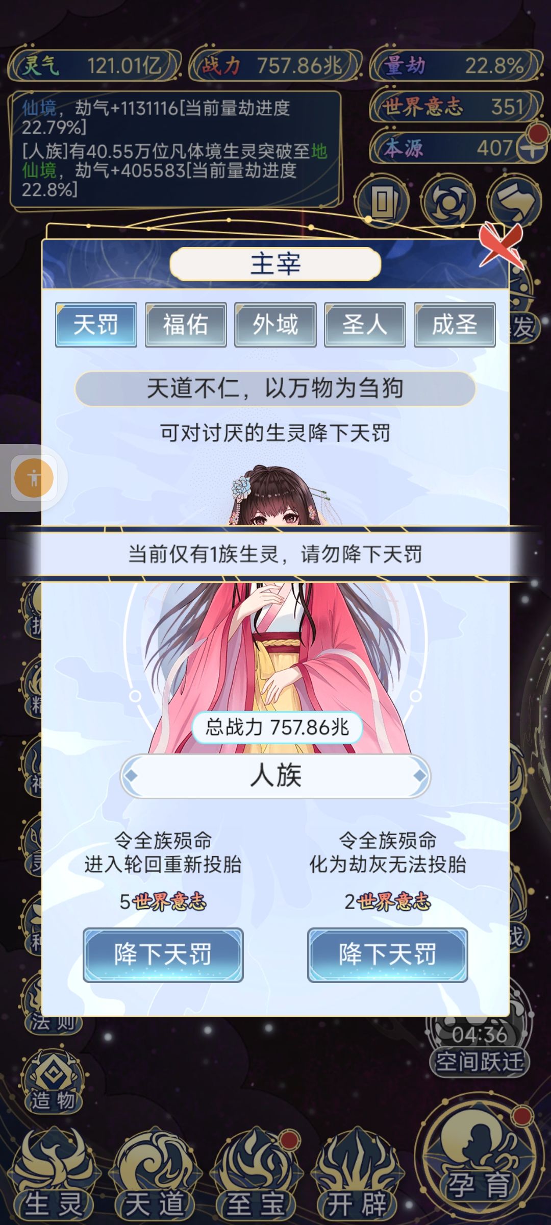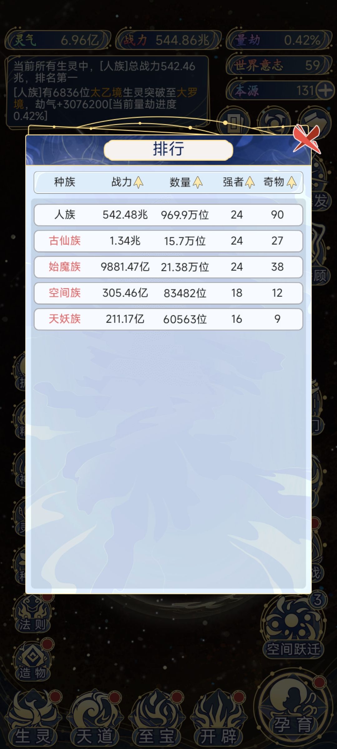 第一玩这个游戏分为两类分别为 追求数据,培养核心种族的战力派。 追求和平自由发展的博爱派。 他们他们有着本质的区别,但并非对立,整个游戏都围绕着两个字战力,不管是灵气,生灵,孕育还是本源、世界意志,他们都会归于战力的提升,而战力的提升可以给你带来更大的能力与权限。如诸神之战、主宰、命运之门。 而战而战力中的来源于生灵中的种族。 在我看来,种族并没有强弱之分,只是出生的时机与气运罢了。众人所说的人族
